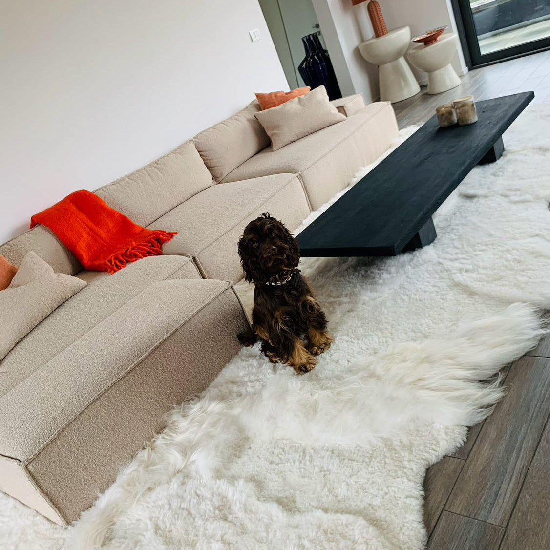 een trotse viervoeter poseert hier bij een mooi vloerkleed uit witte schapenvachten inclusief langer haar