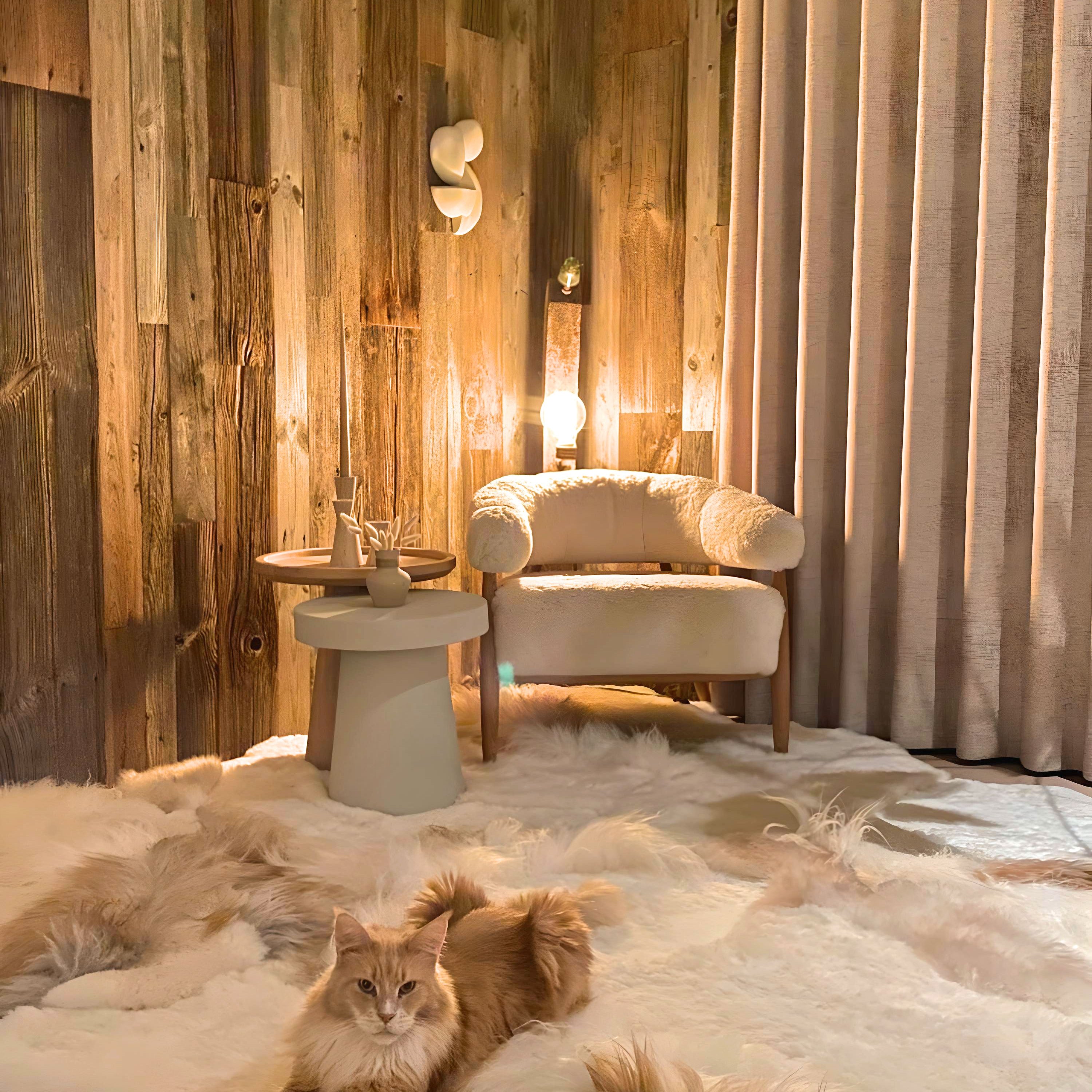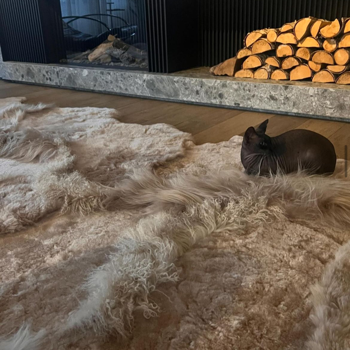 Dit chalet krijgt extra allure dankzij een tapijt van 5 aan elkaar genaaide schapenvachten in een zeldzaam melange kleur.