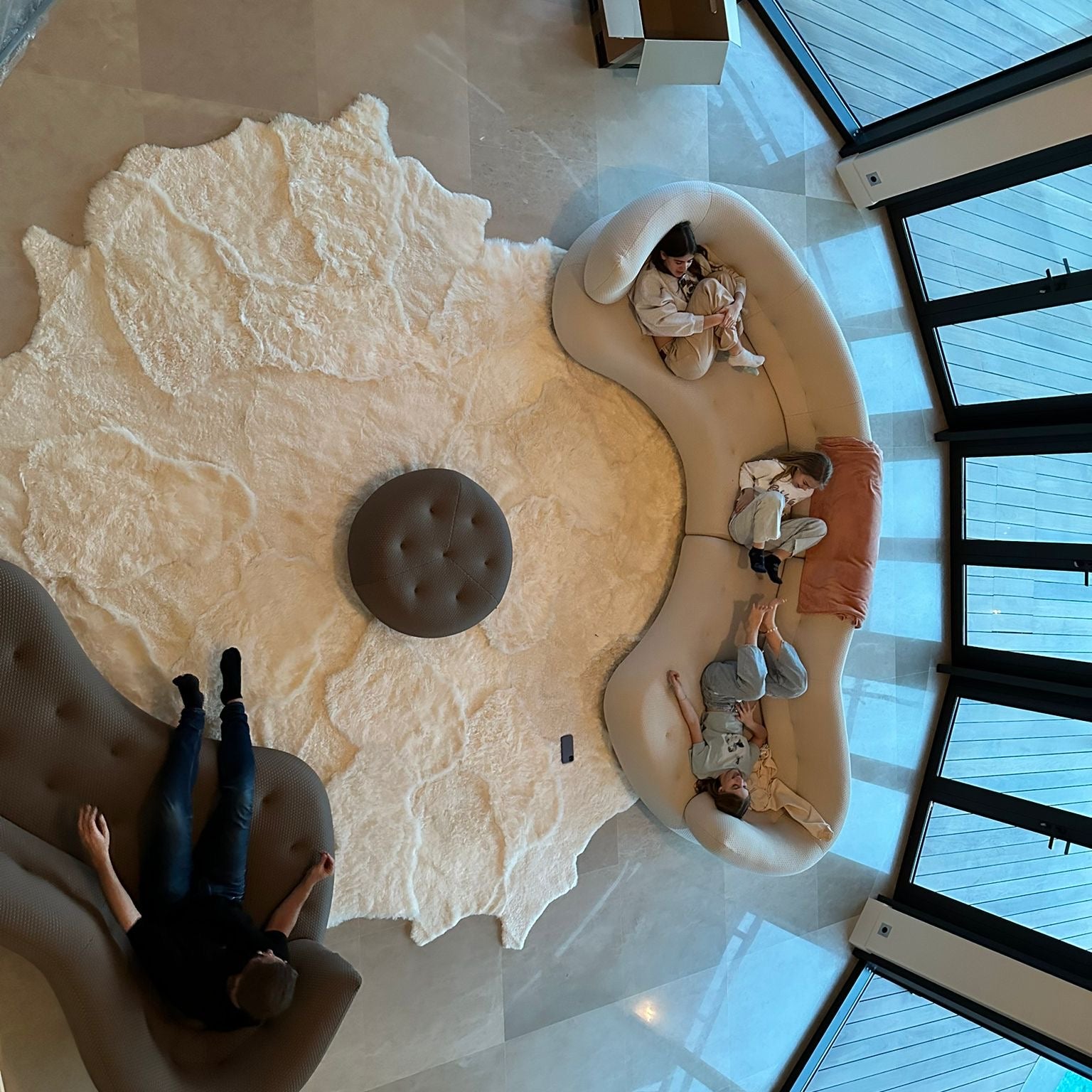 Dit Spaans interieur kreeg een rond tapijt uit IJslandse schapenvachten zonder het lange haar.