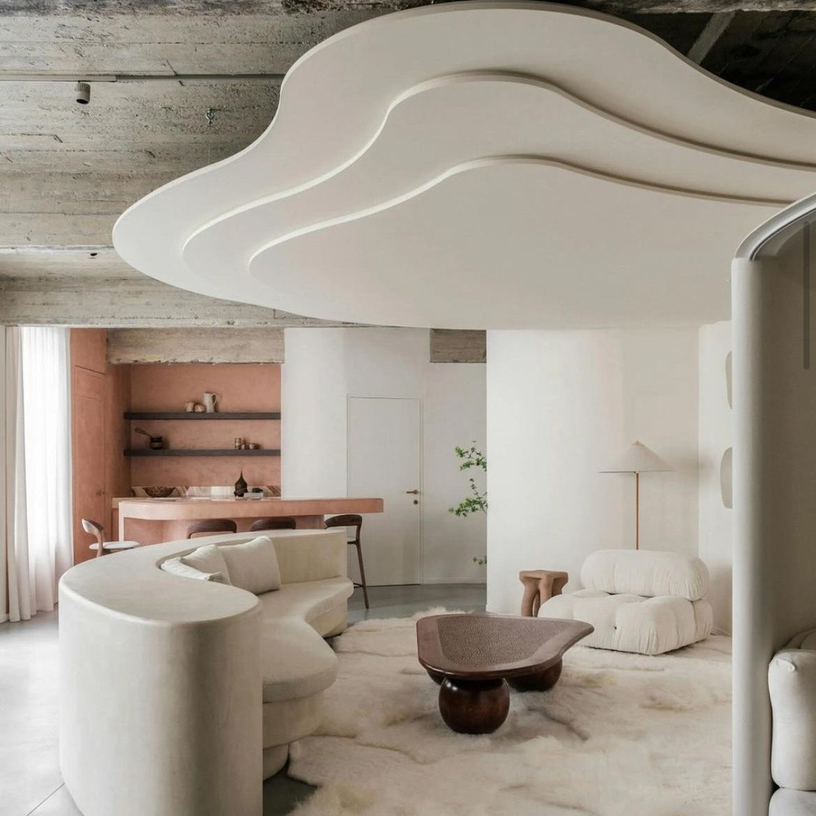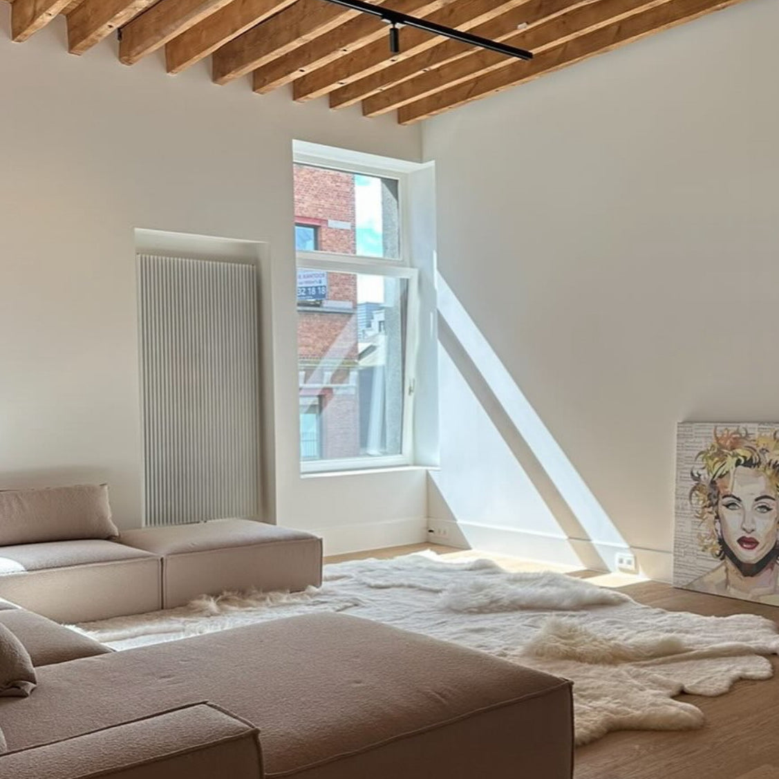 Groot Antwerps loft wordt cozy dankzij dit grote tapijt in off white