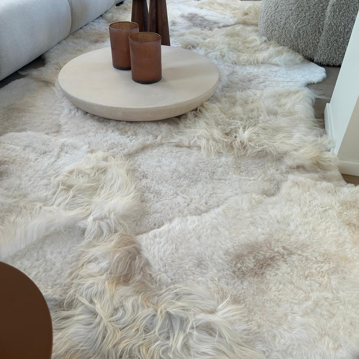 Modern en strak tapijt uit IJslandse schapenvachten zonder het lange haar.
